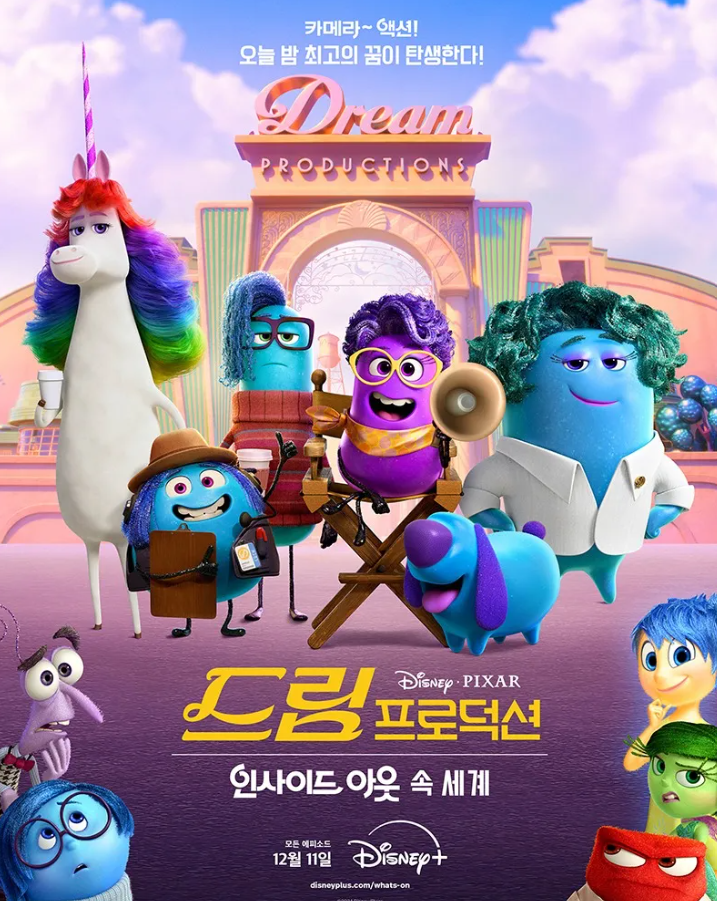 너무 귀여운 따끈따끈한 애니메이션을 보고 왔습니다. 그 이름은 바로 '드림 프로덕션(Dream Productions)'입니다. 이 작품은 디즈니 플러스 오리지널 작품으로서 인사이드 아웃 시리즈의 스핀오프 애니메이션입니다. 1편과 2편 사이를 배경으로 하며 1편에 등장한 라일리의 머리 속 꿈을 제작하는 건물인 '꿈 제작소'에서 벌어지는 이야기를 페이크 다큐멘터리 형식으로 다룹니다. 총 4부작이며 픽사 애니메이션 스튜디오에서 제작했고 감독은 발레리 라포인티, 오스틴 매디슨, 마이크 존스가 맡았습니다. 시놉시스는 이러합니다. 라일리가 성장하면서 추가 처리 과정이 필요한 기억들이 생기면, 기쁨이와 나머지 핵심 감정들은 그 기억들을 꿈 제작소로 보냅비다. 예를 들어 이제 쪽쪽이를 떼야 하는 시기가 오면 쪽쪽이와 아름답게 이별하는 꿈을 제작해 쪽쪽이와의 이별을 돕는 등 라일리의 무의식 속에서 라일리를 위한 꿈을 제작하는 프로덕션 내용입니다. 왕년 스타 감독이었던 폴라 퍼시먼은 요즘에 흥행 성적이 떨어져 퇴출 위기에 처해있습니다. 그러한 와중에 본인과는 스타일이 전혀 맞지 않는 백일몽 전문 감독 제니와 새로운 흥행작을 만들어내야 하는 악몽 같은 상황에 직면하게 됩니다. 과연 폴라는 이 역경을 딛고 다시 한번 재기할 수 있을까요?