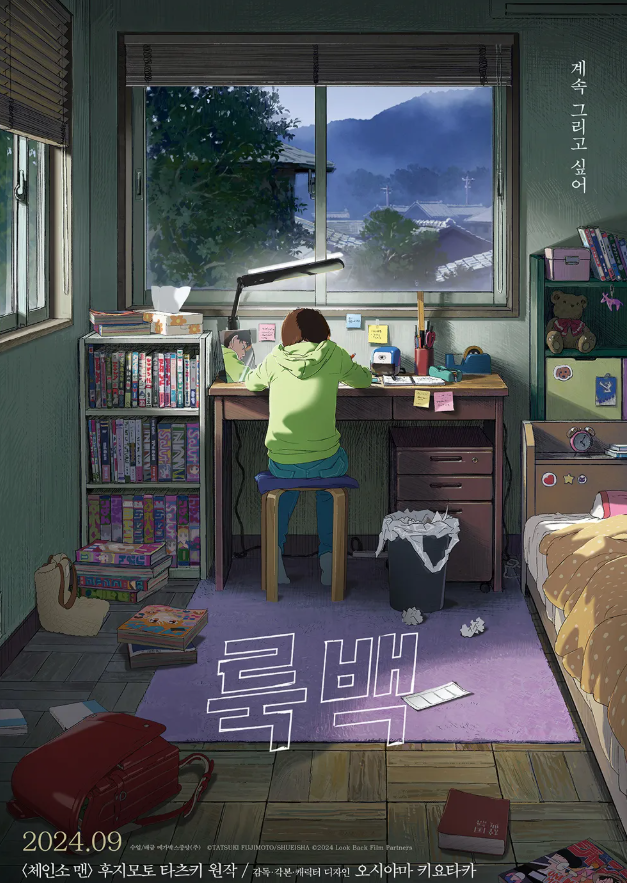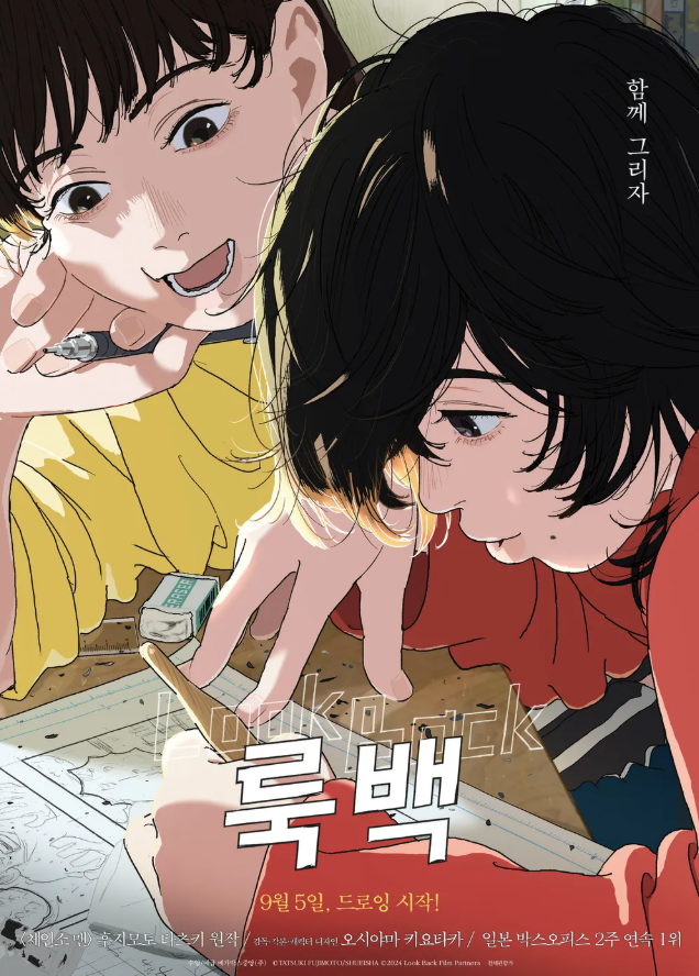 비주얼이 너무 귀엽고 감성적인 애니메이션 영화를 가져와봤습니다. 바로 '룩 백(Look Back)'입니다. 이 영화는 체인소 맨과 파이어 펀치의 작가로 유명한 후지모토 타츠키의 2021년작 단편 만화 룩 백을 원작으로 하는 2024년작 장편 애니메이션입니다. 감독은 오시야마 키요타카입니다. 후지노 역은 카와이 유미, 쿄모토 역은 요시다 미즈키가 성우입니다. 이 영화는 '그림'을 매개로 연결된 두 소녀의 성장, 우정, 그리고 상실을 다룬 감성적인 이야기입니다.