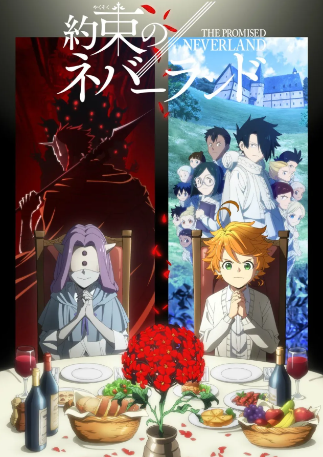 제가 이번에 소개할 작품은 '약속의 네버랜드'입니다. 일본어로는 ' 約束やくそくのネバーランド '이며 영어로는 ' The Promised Neverland '라고 합니다. 2019년 1월에 방영했으며, 장르는 다크 판타지, 서스펜스, 액션, 모험이며 감독은 칸베 마모루가 맡았습니다. 그는 스릴러에 능한 감독으로서 특히 약속의 네버랜드 1기는 일본뿐만 아니라 해외에서도 큰 인기를 얻었습니다. 원작 및 원안은 시라이 카이우, 작화는 데미즈 포스카가 맡았습니다. 배경 설정은 이러합니다. 어머니처럼 생각하지만 부모는 아닌 사람, 그리고 함께 살지만 형제가 아닌 그들 이 곳은 고아원이지만 서로를 가족처럼 생각하며 행복하게 보내고 있습니다. 그러나 이름: 그레이스 필드라는 이 낙원에는 비밀이 있습니다. 그 비밀은 밑에 자세히 설명하겠습니다.